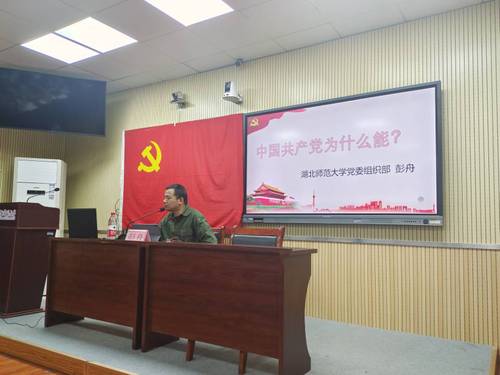 彭舟老师首先以两部视频为引子生动回答了中国共产党为什么能,指出中国共产党走过的一百年是沧海巨变的一百年,中国共产党人要始终高举马克思主义旗帜,坚定不移地坚持和发展马克思主义。他指出习近平新时代中国特色社会主义思想是中华民族伟大复兴的思想理论基础,是新时代中国共产党人的思想旗帜。最后,彭舟老师介绍到,中国共产党拥有着强大的组织优势以及严密的组织体系,中国共产党始终坚持民主集中制,坚持以人民为中心,一切为了人民,强调中国共产党代表的是最广大人民的利益,并指出中国共产党勇于自我革命、自我净化、自我发展、自我提高的精神。