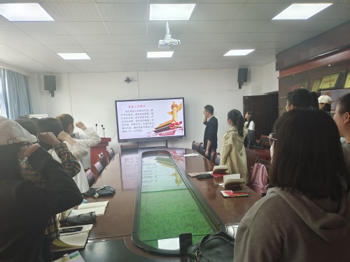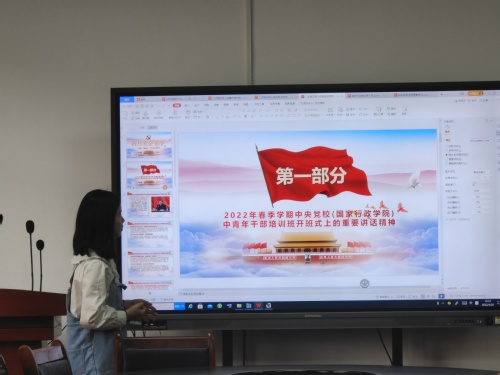首先进行的是缴纳党费环节,随后全体党员集体重温入党誓词、集体朗诵《党章》。接着,学生党员杨钰璟带领大家深入学习全国“两会”精神,学生党员董雨楠领学习近平总书记在参加首都义务植树活动和北京冬奥会、冬残奥会总结表彰大会上的重要讲话,学生党员向琳洁领学《求是》杂志第六期发表的《在中央政协工作会议暨庆祝中国人民政治协商会议成立70周年大会上的讲话》和第七期发表的《坚持把解决好“三农”问题作为全党工作重中之重,举全党全社会之力推动乡村振兴》两篇文章。之后,由第四党小组张佩瑶作为党员代表谈心得体会。最后,张琦老师以深入学习贯彻习近平总书记关于总体国家安全观的系列重要论述精神为主题讲授微党课,他强调了国家安全的重要性,并介绍了习总书记关于坚持总体国家安全观、维护重点领域国家安全等方面的论述。