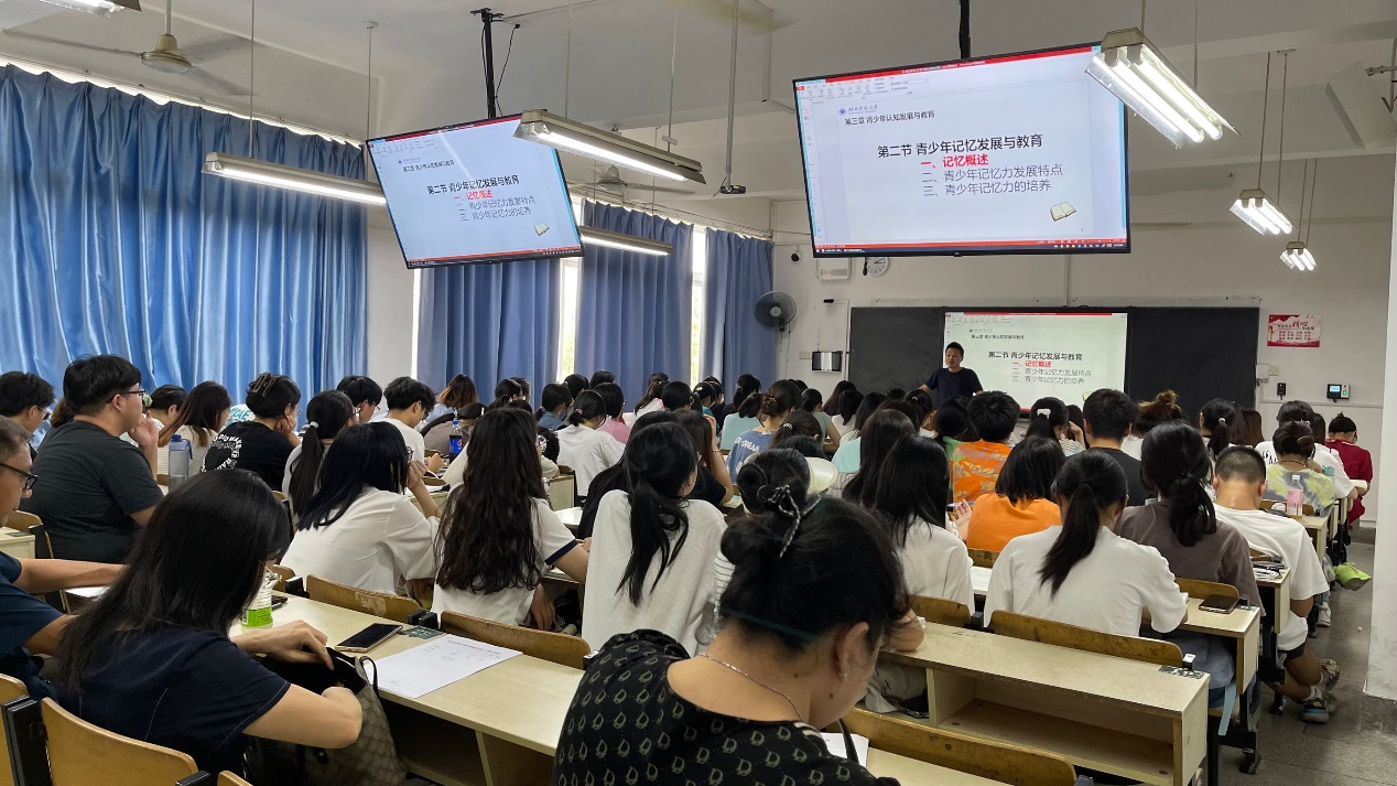 在当天下午第六节课,心理学系王文教授、谭雪晴副教授、曹中保副教授、向光富副教授、龚艺华副教授、吴娜博士、刘艳春博士在教育大楼的1205教室一起听了何明成博士主讲的公共课《教育心理学》中的“青少年记忆发展与教育”这一节课。在课程一开始,何博士回顾了上一节课的内容,随后分别从什么是记忆、青少年记忆发展特点、青少年记忆力的培养几个方面详细地讲授了青少年的记忆发展与教育。教学内容丰富,教学形式多样,教学时间安排合理,给全体师生带来了一场非常精彩的公开课。