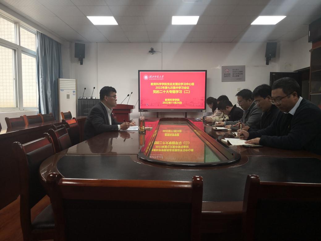 2022年11月24日上午,教科院党总支在教育大楼1317A会议室召开了理论学习中心组2022年第七次学习会议,再次专题学习中国共产党第二十次全国代表大会会议精神。会议由院党总支书记徐明波主持,全体党总支成员和党政办主任参加了会议。