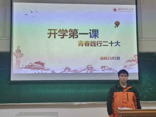 班会伊始,班长唐陈晨通过视频为大家介绍了党的二十大的主题与精神内涵。随后,他分享了自己在寒假过程中的见闻与感悟,并呼吁同学们做好新学期规划,明确自身学习目标。接着,徐燕敏老师向大家强调了新学期同学们的人身安全问题。她希望同学们能够遵守学校规章制度,注意自身安全防护。同时,要按时完成教师培训课程。最后,三位学生代表围绕新学期规划等主题相继上台发言。