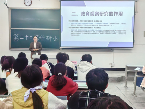会议伊始,陶丽老师就“如何进行教育观察研究及实践”进行了讲解,她主要从什么是教育观察研究、教育观察研究的作用、如何进行教育观察研究以及实施观察活动的注意事项等四个方面进行了阐述。其次,她详细介绍了观察记录的常用方法及其示例,使成员们对研究方法有了更清楚的认识。在本次活动中,同学们积极回答老师的问题,大胆表达个人观点。最后,创新创业部部长张蕊布置了此次科研小组的作业。