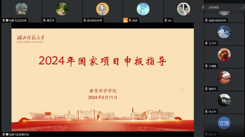 为进一步推进国家社科基金项目、全国教育科学规划项目申报工作,5月11日晚,我院邀请湖北大学靖国平教授、华中科技大学李太平教授、北京大学蒋凯教授、湖南师范大学王卫华教授、湖北省教育科学研究院张传萍研究员、华中师范大学涂艳国教授通过腾讯会议对我院教师进行项目申报指导。本次会议由副院长崔波主持,项目申报负责人和部分教师参加了本次活动。