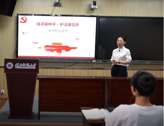 赵幸博士以《教师职业道德》课程为依托,以“教师廉洁从教”为主题,从“廉洁的含义”“教师廉洁从教的含义与意义”“教师廉洁从教的基本要求”“教师廉洁从教的主要路径”四个方面进行教学设计。课堂教学内容丰富、形式新颖,主要以观看廉洁微视频、解读最新政策要求、引入校园廉洁文化标识等形式开展课堂教学,引导学生进行课堂互动,以激发学生参与的积极性。这不仅能引导学生形成正确的价值观和道德观,树立正确的教师职业认知,也进一步推动了清廉教育理念的传播与实践。