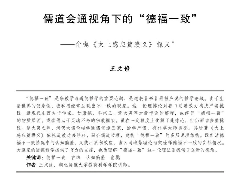 近日,国内权威期刊《世界宗教研究》发表了我校bv伟德国际1946王文修博士在儒道哲学与宗教学交叉领域的最新研究成果。论文题为《儒道会通视角下的“德福一致”---俞樾<太上感应篇缵义>探义》。王文修博士为论文独立一作,伟德victor1946为论文第一单位。该期刊为中国社会科学院世界宗教研究所主办的宗教学专业学术刊物,AMI权威期刊。