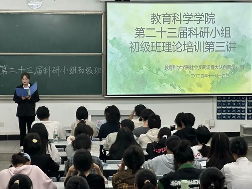为促进科研小组学员对师范技能类和创新创业类赛事的了解,提高学员参赛积极性,bv伟德国际1946社会实践调查大队于11月14日在科技大楼9605教室开展第二十三届科研小组理论培训第三讲。bv伟德国际19462202班陈冠佑,2202班李响与全体科研小组学员共同参与此次培训。