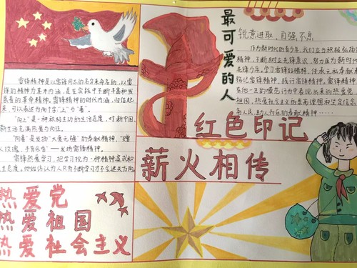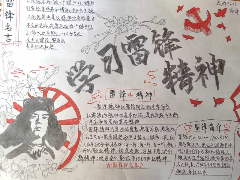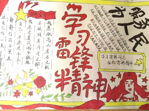 活动伊始,创新创业部发布活动通知,并积极开展宣传工作。随后,工作人员收集整理同学们精心制作的手抄报,并在“湖师教科”公众号上开展民主投票。根据投票结果,最终确定作品的排名。其中,李想、向阳同学荣获一等奖,袁嘉宁、马紫璇、杨洋同学获得二等奖,刘艺芯、王萌萌、袁可欣、杨宇彤同学获得三等奖,这些获奖作品大多以红色文化为主基调,生动表达出红色情怀以及燃烧自己、无私奉献的炽热之心。文字部分主要围绕雷锋事迹和当代雷锋精神的具体表现展开,充分展现了同学们对雷锋精神的传承与发扬。