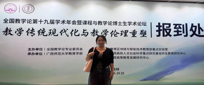 2025年9月26至28日,全国教学论第十九届学术年会暨课程教学论博士生学术论坛在广西师范大学举行。本届年会主题为“教学传统现代化与教学伦理重塑”,来自全国近500名教育专家、学者、研究生参会,我院陶丽副教授指导的课程与教学论研究生许条红、小学教育研究生张琪参与了此次学术年会。