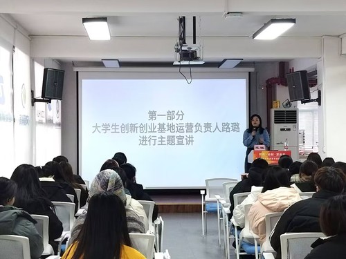 首先,主持人对出席本次活动的嘉宾及活动流程进行了简单介绍。接着,主讲人路璐进行了主题宣讲,介绍了创新创业学院的运营情况,还为大家详细讲解了学院和政府颁布的关于大学生创新创业活动的政策,并鼓励大家积极参与到创业热潮中。随后,主讲人与在场的观众进行互动,路璐老师耐心解答了同学们提出的有关项目路演、创业方向等的问题。最后,老师向大家提出了几点有关创新创业的看法与建议,也鼓励有意向的同学积极向相关人员寻求帮助。