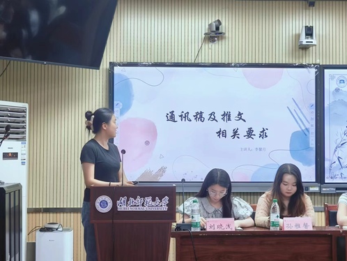 活动伊始,刘晓浅向新任学生干部们说明物品采购、财务报销及教室借用流程,强调相关注意事项,要求线上线下始终按照流程进行。接着,青年传媒中心前任部长李馨月讲解了通讯稿与推文格式要求,并列举了部分曾经出现过的错误来提醒各学生干部。之后,刘施雨给新任学生干部详细地讲解了到梦空间的使用方法以及怎样及时解决出现的问题。最后,刘诗雅补充强调各部门工作注意事项,并勉励新任学生干部认真工作,恪守职责。