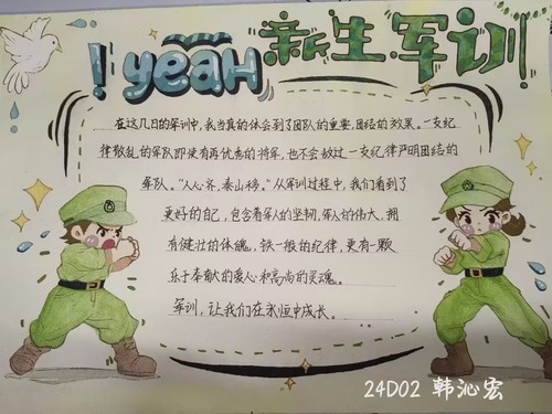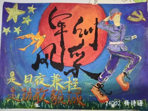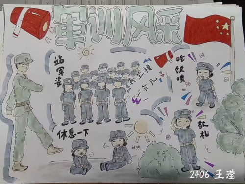 在活动中,同学们尽情挥洒创意,用画笔诠释了自己对军训的理解和感悟。作品涵盖了庄重的敬礼瞬间、辛勤训练的汗水印记,以及对国旗的崇高敬意。经过微信公众号推文的公开投票,最终评选出以下获奖者:一等奖:罗金晶,二等奖:周范娓、王滢,三等奖:张世红、韩沁宏、朱维宇。